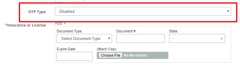 2) Click in the "OTP Type" box and select if you would like your second factor to be by email or SMS