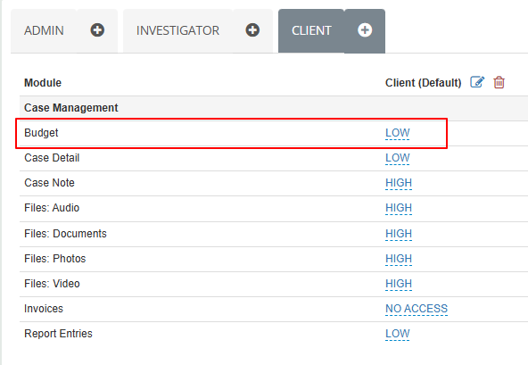2) Click the "Client" tab, then make sure the module "Budget" is set to LOW