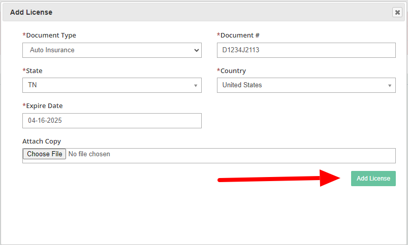 Fill in all the required fields, attach a photo of the document, and then click Add License.